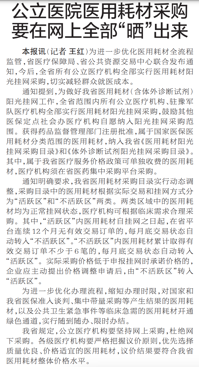 为进一步优化医用耗材全流程监管,省医疗保障局、省公共资源交易中心联合发布通知,今后,全省所有公立医疗机构全部实行医用耗材阳光挂网采购,切实减轻群众就医成本。(今日《郑州日报》2版)