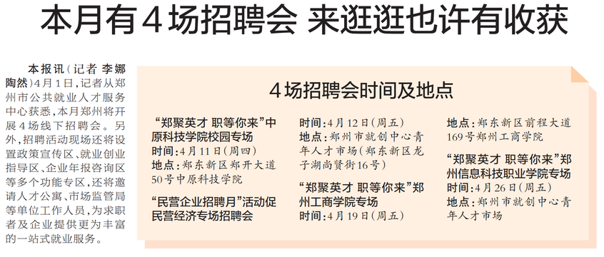 4月1日,记者从郑州市公共就业人才服务中心获悉,本月郑州将开展4场线下招聘会。另外,招聘活动现场还将设置政策宣传区、就业创业指导区、企业年报咨询区等多个功能专区,还将邀请人才公寓、市场监管局等单位工作人员,为求职者及企业提供更为丰富的一站式就业服务。(今日《郑州日报》2版)