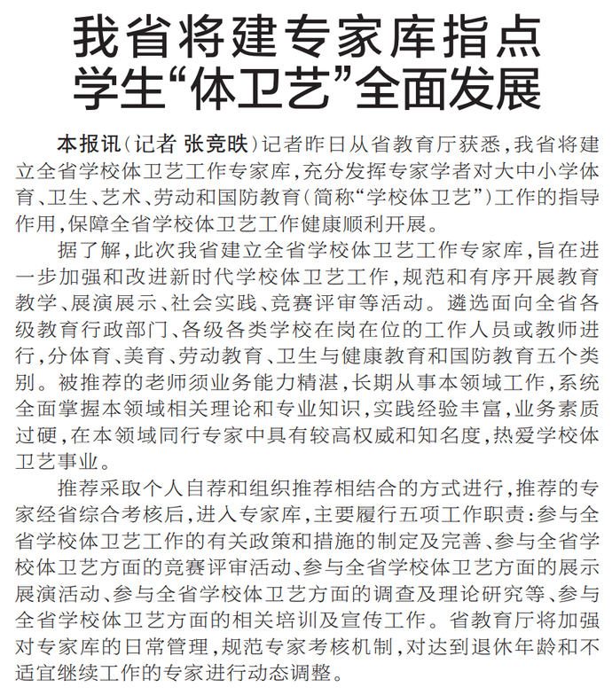 记者昨日从省教育厅获悉,我省将建立全省学校体卫艺工作专家库,充分发挥专家学者对大中小学体育、卫生、艺术、劳动和国防教育(简称“学校体卫艺”)工作的指导作用,保障全省学校体卫艺工作健康顺利开展。(今日《郑州日报》2版)