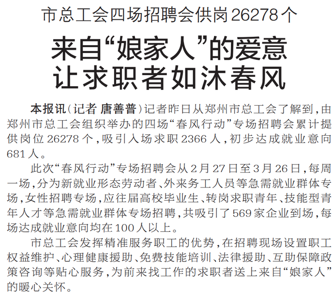 记者昨日从郑州市总工会了解到,由郑州市总工会组织举办的四场“春风行动”专场招聘会累计提供岗位26278个,吸引入场求职2366人,初步达成就业意向681人。(今日《郑州日报》2版)