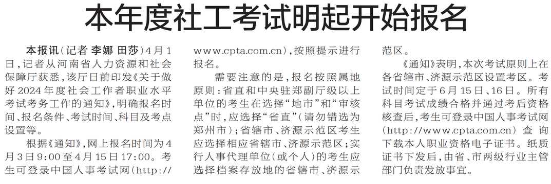 4月1日,记者从河南省人力资源和社会保障厅获悉,该厅日前印发《关于做好2024年度社会工作者职业水平考试考务工作的通知》,明确报名时间、报名条件、考试时间、科目及考点设置等。(今日《郑州日报》2版)