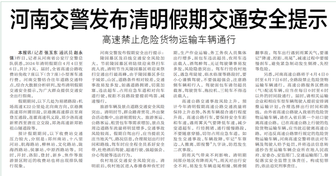 昨日,记者从河南省公安厅交警总队获悉,2024年清明假期自4月4日至6日,共计3天。届时,全省高速公路收费站免收7座以下(含7座)小型客车通行费。河南交警结合往年道路交通特点,综合大数据分析研判,发布清明假期交通安全提示,为广大群众提供交通安全出行指南。(今日《郑州日报》5版)