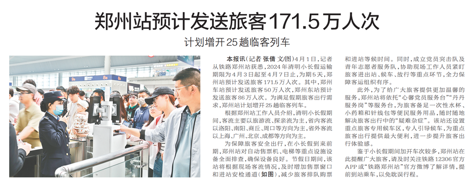 4月1日,记者从铁路郑州站获悉,2024年清明小长假运输期限为4月3日起至4月7日止,为期5天,郑州站预计发送旅客171.5万人次。其中,郑州车站预计发送旅客50万人次,郑州东站预计发送旅客86万人次。为满足假期旅客出行需求,郑州站计划增开25趟临客列车。(今日《郑州日报》5版)