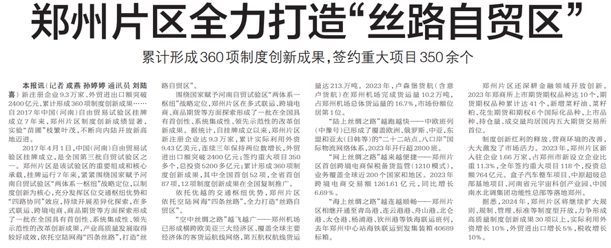 新注册企业9.3万家、外贸进出口额突破2400亿元、累计形成360项制度创新成果……自2017年中国(河南)自由贸易试验区挂牌成立7年来,郑州片区制度创新成绩显著,实验“苗圃”枝繁叶茂,不断向内陆开放新高地迈进。(今日《郑州日报》6版)