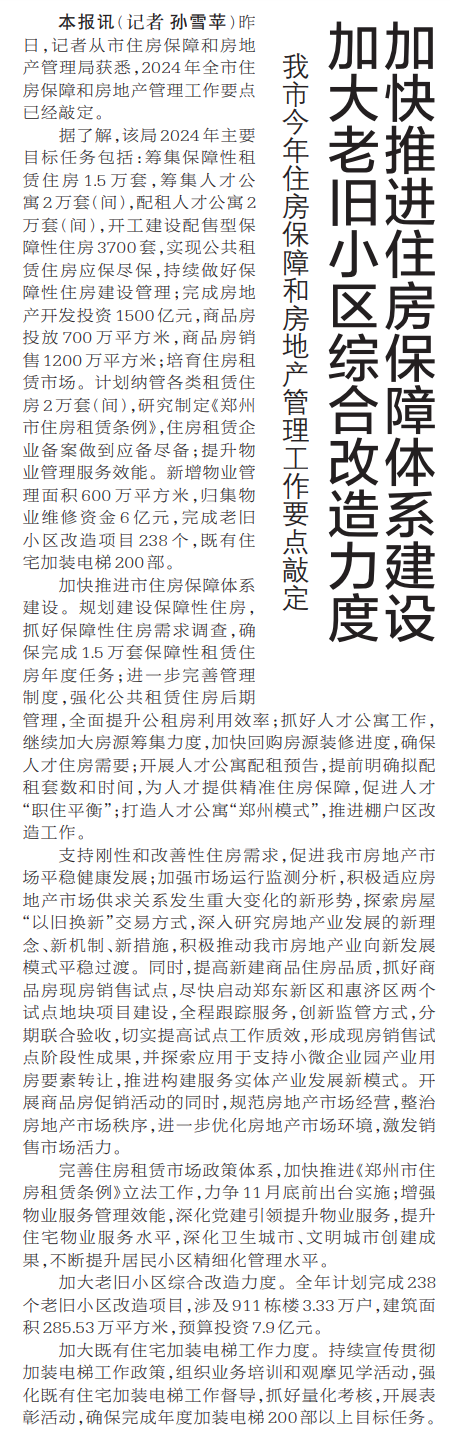 昨日,记者从市住房保障和房地产管理局获悉,2024年全市住房保障和房地产管理工作要点已经敲定。(今日《郑州日报》6版)