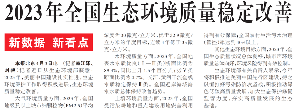 记者近日从生态环境部获悉:2023年,美丽中国建设扎实推进,生态环境保护工作取得积极进展,生态环境质量稳定改善。(今日《人民日报》1版)