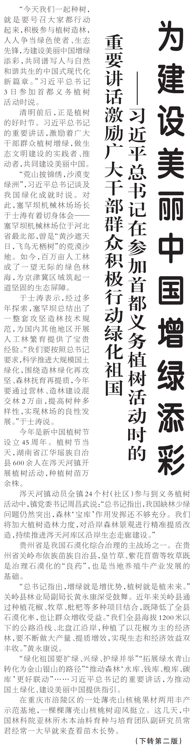 ——习近平总书记在参加首都义务植树活动时的重要讲话激励广大干部群众积极行动绿化祖国