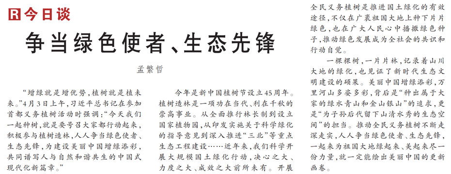 “增绿就是增优势,植树就是植未来。”4月3日上午,习近平总书记在参加首都义务植树活动时强调:“今天我们一起种树,就是要号召大家都行动起来,积极参与植树造林,人人争当绿色使者、生态先锋,为建设美丽中国增绿添彩,共同谱写人与自然和谐共生的中国式现代化新篇章。”(今日《人民日报》1版)