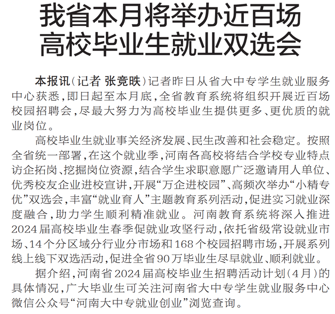 记者昨日从省大中专学生就业服务中心获悉,即日起至本月底,全省教育系统将组织开展近百场校园招聘会,尽最大努力为高校毕业生提供更多、更优质的就业岗位。(今日《郑州日报》1版)