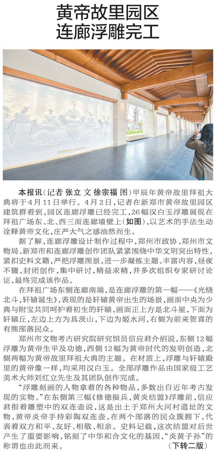 甲辰年黄帝故里拜祖大典将于4月11日举行。4月2日,记者在新郑市黄帝故里园区建筑群看到,园区连廊浮雕已经完工,26幅汉白玉浮雕展现在拜祖广场东、北、西三面连廊墙壁上,以艺术的手法生动诠释黄帝文化,庄严大气之感油然而生。(今日《郑州日报》1版、2版)