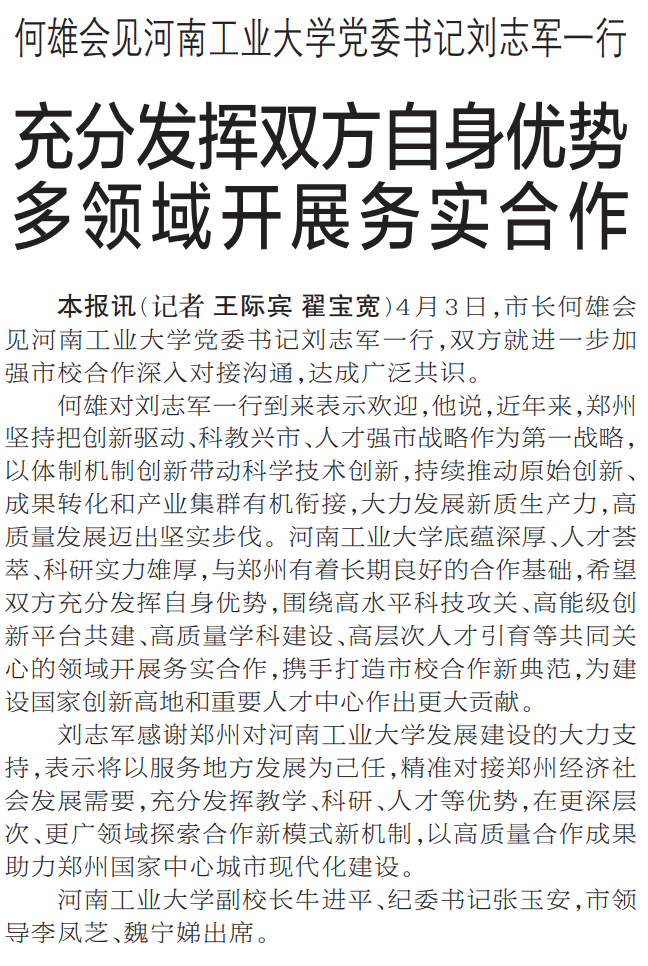 4月3日,市长何雄会见河南工业大学党委书记刘志军一行,双方就进一步加强市校合作深入对接沟通,达成广泛共识。(今日《郑州日报》1版)