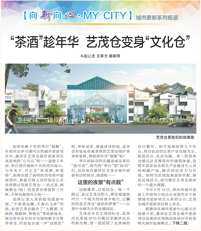 如果长醉千年的李白“复醒”,在郑州众多可圈可点的城市更新项目中,惠济区艺茂仓城市更新项目该是他的“心尖尖”吧——遥想千年前,李白曾在峻极于天的郑州嵩山,与岑夫子、丹丘生“将进酒,杯莫停”,如果在湿了清明的杏花雨中重游郑州,素爱引酒入诗的他怎么会舍得错过览游艺茂仓(一站式茶、酒集散仓)呢?怕是要长啸复饮三百杯,不辞长做郑州人吧……(今日《郑州日报》1版、2版)