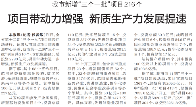 昨日,全省第十二期“三个一批”项目建设活动举行。记者从市重点项目建设推进中心获悉,我市第十二期“三个一批”项目共216个(含航空港区),总投资2290亿元,项目带动力进一步增强,新质生产力发展提速。(今日《郑州日报》2版)
