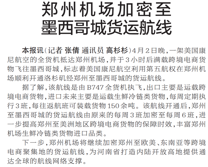4月2日晚,一架美国康尼航空的全货机抵达郑州机场,并于3小时后满载跨境电商货物飞往墨西哥城,标志着美国康尼航空利用第五航权在郑州机场顺利开通洛杉矶经郑州至墨西哥城的货运航线。(今日《郑州日报》2版)