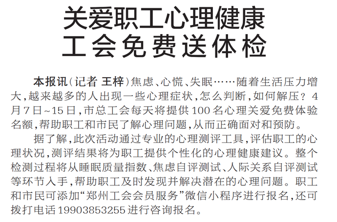 焦虑、心慌、失眠……随着生活压力增大,越来越多的人出现一些心理症状,怎么判断,如何解压?4月7日~15日,市总工会每天将提供100名心理关爱免费体验名额,帮助职工和市民了解心理问题,从而正确面对和预防。(今日《郑州日报》2版)