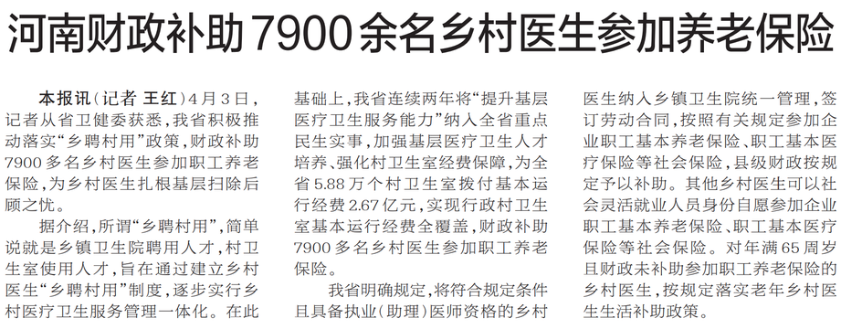 4月3日,记者从省卫健委获悉,我省积极推动落实“乡聘村用”政策,财政补助7900多名乡村医生参加职工养老保险,为乡村医生扎根基层扫除后顾之忧。(今日《郑州日报》2版)