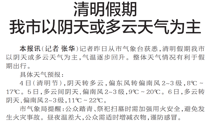记者昨日从市气象台获悉,清明假期我市以阴天或多云天气为主,气温逐步回升。整体天气情况有利于假期出行。(今日《郑州日报》3版)