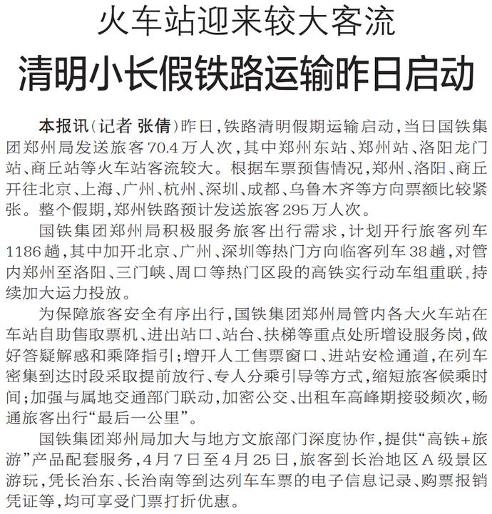 昨日,铁路清明假期运输启动,当日国铁集团郑州局发送旅客70.4万人次,其中郑州东站、郑州站、洛阳龙门站、商丘站等火车站客流较大。根据车票预售情况,郑州、洛阳、商丘开往北京、上海、广州、杭州、深圳、成都、乌鲁木齐等方向票额比较紧张。整个假期,郑州铁路预计发送旅客295万人次。(今日《郑州日报》3版)
