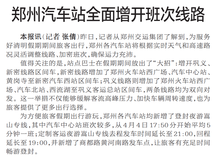 昨日,记者从郑州交运集团了解到,为服务好清明假期期间旅客出行,郑州各汽车站将根据实时天气和高速路况灵活调整线路、加密班次,确保运力充沛。(今日《郑州日报》3版)