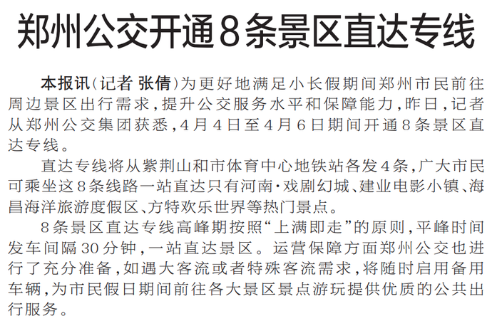 为更好地满足小长假期间郑州市民前往周边景区出行需求,提升公交服务水平和保障能力,昨日,记者从郑州公交集团获悉,4月4日至4月6日期间开通8条景区直达专线。(今日《郑州日报》3版)