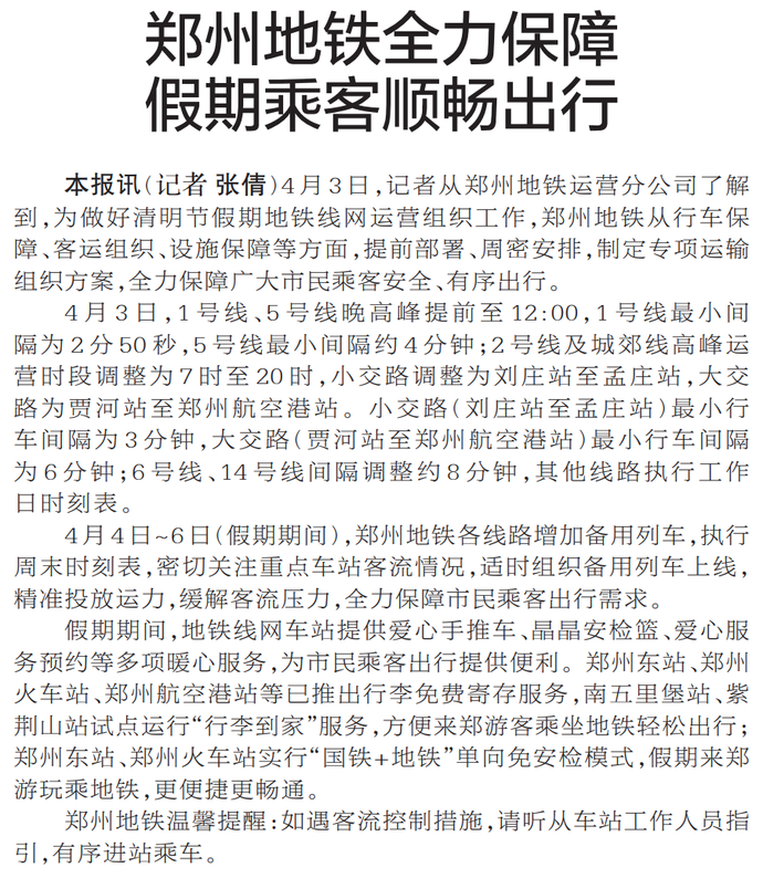 4月3日,记者从郑州地铁运营分公司了解到,为做好清明节假期地铁线网运营组织工作,郑州地铁从行车保障、客运组织、设施保障等方面,提前部署、周密安排,制定专项运输组织方案,全力保障广大市民乘客安全、有序出行。(今日《郑州日报》3版)