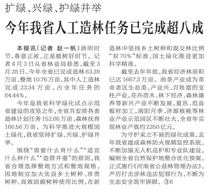 清明时节,春意正浓,正是植树好时节。记者4月3日从省林业局获悉,截至3月28日,今年全省已完成造林63.39万亩、整地10.76万亩,其中人工造林完成23.34万亩,占全年任务的84.44%。(今日《河南日报》1版)