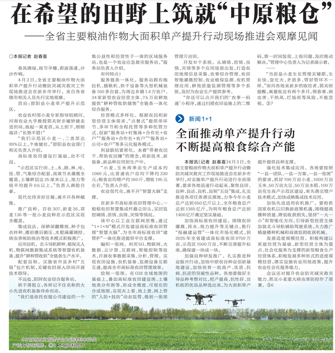 4月2日,全省主要粮油作物大面积单产提升行动暨防灾减灾救灾工作现场推进会在新乡市举行,对实施单产提升行动进行全面部署,要求各地迅速行动起来,聚焦良田、良种、良法、良机、良制“五良”集成,扎实推进各项任务落实落地,力争今年小麦总产达到650亿斤以上,全年粮食总产达到1365亿斤,为明年粮食总产达到1400亿斤奠定坚实基础。(今日《河南日报》3版)