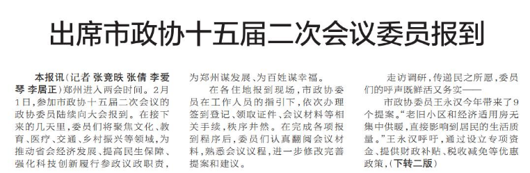 郑州进入两会时间。2月1日,参加市政协十五届二次会议的政协委员陆续向大会报到。在接下来的几天里,委员们将聚焦文化、教育、医疗、交通、乡村振兴等领域,为推动省会经济发展、提高民生保障、强化科技创新履行参政议政职责,为郑州谋发展、为百姓谋幸福。(今日《郑州日报》1版、2版)