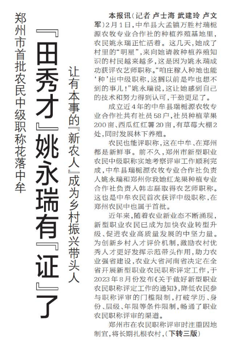 2月1日,中牟县大孟镇万胜村瑞栀源农牧专业合作社的种植养殖基地里,农民姚永瑞正忙活着。这几天,她成了村里的“明星”,来向她请教种植养殖知识的村民越来越多,这是因为姚永瑞成功获评农艺师职称。“咱庄稼人种地也能‘种’出中级职称,这搁以前是咋也想不到的事儿!”姚永瑞说,这让她感到自己的技术和努力得到认可,干劲更足了。(今日《郑州日报》1版、3版)