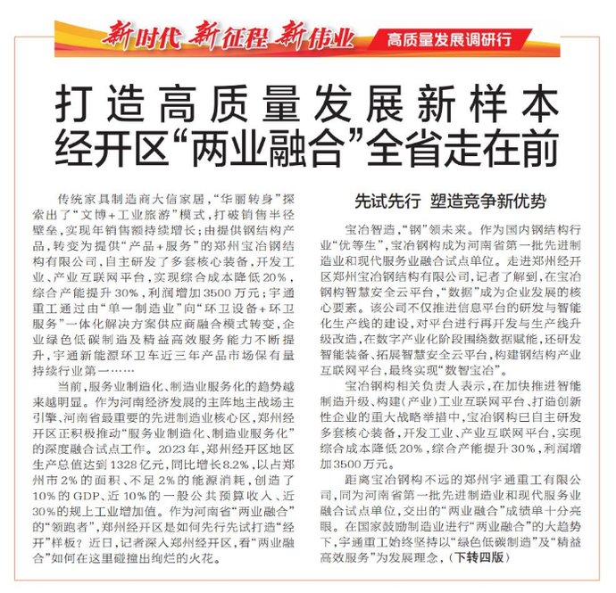 传统家具制造商大信家居,“华丽转身”探索出了“文博+工业旅游”模式,打破销售半径壁垒,实现年销售额持续增长;由提供钢结构产品,转变为提供“产品+服务”的郑州宝冶钢结构有限公司,自主研发了多套核心装备,开发工业、产业互联网平台,实现综合成本降低20%,综合产能提升30%,利润增加3500万元;宇通重工通过由“单一制造业”向“环卫设备+环卫服务”一体化解决方案供应商融合模式转变,企业绿色低碳制造及精益高效服务能力不断提升,宇通新能源环卫车近三年产品市场保有量持续行业第一……(今日《郑州日报》1版、4版)