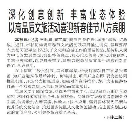 春节日益临近,城市“年味儿”渐浓。近日,市长何雄调研春节文旅活动及项目推进情况,强调要深入贯彻习近平总书记关于文化和旅游工作的重要论述,坚持以人民为中心的发展思想,突出特色亮点、精心策划筹备,深化创意创新、丰富业态体验,以更具美誉度、影响力的高品质文旅活动喜迎新春佳节、八方宾朋。(今日《郑州日报》1版、2版)