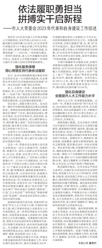 郑州市10199名五级人大代表全部编入代表联络站,全年代表入站28513人次,解决群众反映问题10148件;对36件优秀代表建议和10个建议办理工作先进单位进行表彰,促进代表建议“内容高质量、办理高质量”……2023年,一份份意见建议、一项项代表活动,是人大代表履职为民坚守初心,也是市人大常委会履职一年间深入践行全过程人民民主的厚重成绩单。(今日《郑州日报》2版)
