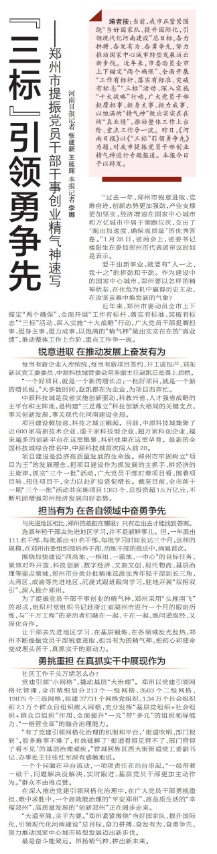 编者按:当前,我市正紧紧围绕“当好国家队、提升国际化,引领现代化河南建设”总目标,奋力拼搏、奋发有为、奋勇争先,努力推动国家中心城市转型发展迈出新步伐。近年来,市委动员全市上下锚定“两个确保”、全面开展“工作有标杆、落实有标准、突破有标志”“三标”活动、深入实施“十大战略”行动,广大党员干部挺膺担事、挺身主事、挺力成事,以饱满的“精气神”做出实实在在的“真业绩”,推动整体工作上台阶、重点工作争一流。昨日,《河南日报》以《“三标”引领勇争先》为题,对我市提振党员干部创业精气神进行专题报道。本报今日予以转发。