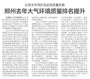 新年伊始,郑州生态环境保护领域传来喜讯:2023年,郑州市空气质量排名在国家实施大气监测的168个重点城市中,同比提升6个位次,取得有监测数据以来的最好成绩。(今日《郑州日报》3版)