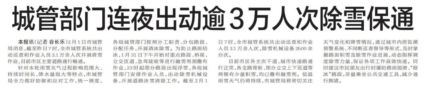 2月1日市城管局消息,截至昨日7时,全市城管系统共出动巡查和作业人员3.1万余人次开展清雪作业,目前市区主要道路通行畅通。(今日《郑州日报》5版)