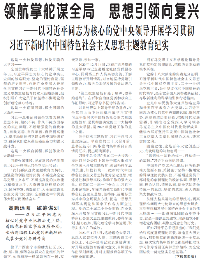 全面贯彻党的二十大精神开局之年,以习近平同志为核心的党中央以宏阔的战略眼光、坚定的理论自觉、强烈的历史担当,作出在全党深入开展学习贯彻习近平新时代中国特色社会主义思想主题教育的重大战略决策,组织引导广大党员干部坚持不懈用党的创新理论凝心铸魂。(今日《人民日报》1版、4版)