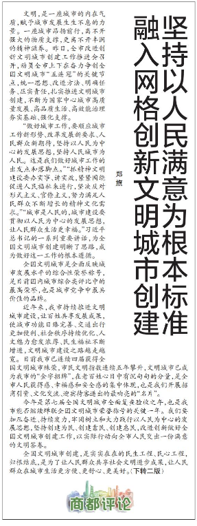 文明,是一座城市的内在气质,赋予城市发展生生不息的力量。一座城市昂扬前行,离不开强大的物质支撑,更离不开丰润的精神滋养。昨日,全市改进创新文明城市创建工作推进会召开,动员全市上下在奋力争创全国文明城市“五连冠”的关键节点,统一思想、改进方法、明确任务、压实责任,扎实推进文明城市创建,不断为国家中心城市高质量发展、高品质生活、高效能治理夯实基础、强化支撑。(今日《郑州日报》1版、2版)