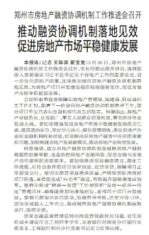 3月26日,郑州市房地产融资协调机制工作推进会召开,市长何雄出席并讲话,强调要深入贯彻落实习近平总书记关于房地产工作的重要论述,进一步优化房地产政策,加快推动城市房地产融资协调机制落地见效,为房地产项目开发建设提供精准融资支持,促进房地产市场平稳健康发展。(今日《郑州日报》1版)