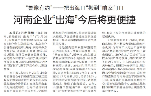 “你好河南,我是你的‘出海口’!”3月26日,山东港口供应链综合服务(河南)推介会在郑州举行。本次推介会旨在依托政府、海关、铁路等多方资源支持,聚集港口、金融、物流、航运、贸易、海外等全要素服务功能,为河南企业带来“一站式”供应链综合服务方案,将港口搬到内陆企业的“家门口”,携手开启合作共赢新篇章。(今日《郑州日报》1版)