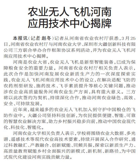 记者从河南省农业农村厅获悉,3月25日,河南省农业农村厅与河南农业大学、深圳市大疆创新科技有限公司三方联合举办合作框架协议系列活动,并为农业无人飞机河南应用技术中心揭牌。(今日《郑州日报》1版)