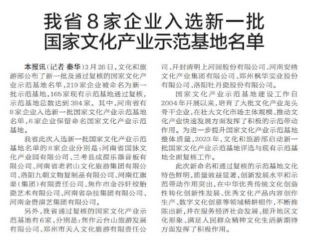 3月26日,文化和旅游部公布了新一批及通过复核的国家文化产业示范基地名单,219家企业被命名为新一批示范基地,165家现有示范基地通过复核,示范基地总数达到384家。其中,河南省有8家企业入选新一批国家文化产业示范基地名单,6家企业保留命名国家文化产业示范基地。(今日《郑州日报》2版)