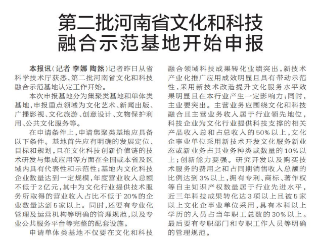 记者昨日从省科学技术厅获悉,第二批河南省文化和科技融合示范基地认定工作开始。(今日《郑州日报》2版)