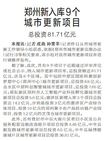 记者昨日从市城市更新工作领导小组获悉,依据《郑州市城市更新实施办法(试行)》等相关要求,该小组对我市城市更新项目库进行调整并发布。(今日《郑州日报》2版)