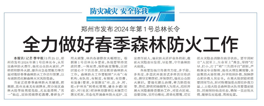 3月25日,郑州市发布2024年第1号总林长令,从压实森林防火责任、强化公众防火意识、严格管控野外火源、提升应急处置能力等方面对做好春季森林防火工作进行部署,以有效防范化解森林火灾风险隐患。(今日《郑州日报》5版)