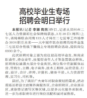 昨日,记者从郑州市二七区人力资源和社会保障局获悉,3月28日(周四)上午,该局将联合河南123人才网在二七区零工市场举办2024职引未来——大中城市联合招聘高校毕业生二七区综合性线下暨线上专场招聘会活动,提供岗位6900余个。(今日《郑州日报》5版)