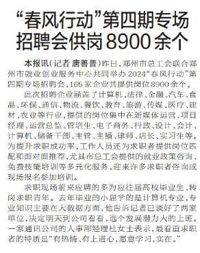 昨日,郑州市总工会联合郑州市就业创业服务中心共同举办2024“春风行动”第四期专场招聘会,165家企业共提供岗位8900余个。(今日《郑州日报》5版)
