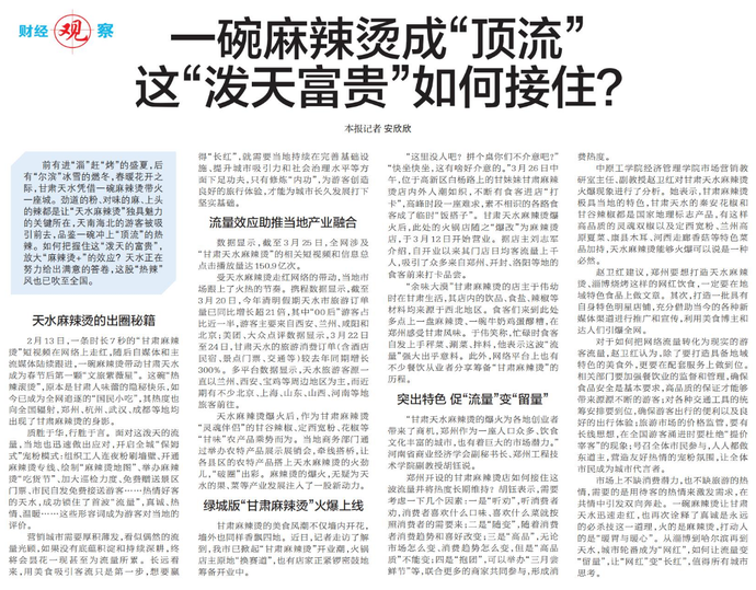 前有进“淄”赶“烤”的盛夏,后有“尔滨”冰雪的燃冬,春暖花开之际,甘肃天水凭借一碗麻辣烫带火一座城。劲道的粉、对味的麻、上头的辣都是让“天水麻辣烫”独具魅力的关键所在,天南海北的游客被吸引前去,品鉴一碗冲上“顶流”的热辣。如何把握住这“泼天的富贵”,放大“麻辣烫+”的效应?天水正在努力给出满意的答卷,这股“热辣”风也已吹至全国。(今日《郑州日报》6版)