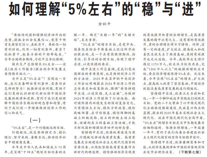 为什么是“5%左右”?实现这一目标,我们具备哪些有利条件,需要付出怎样的努力?把握好这些问题,有助于我们更好认识新时代新征程中国经济发展的规律和逻辑,有利于我们更好理解中国经济长期向好的态势和趋势,有利于我们进一步增强做好经济工作的信心和底气。(今日《人民日报》1版、7版)
