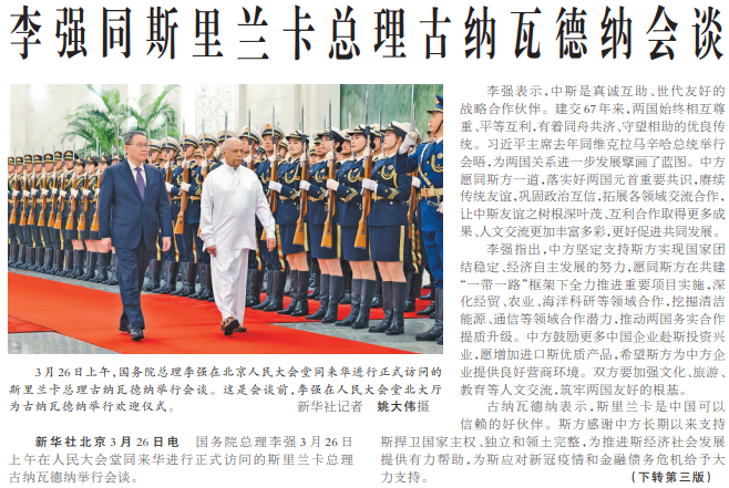 国务院总理李强3月26日上午在人民大会堂同来华进行正式访问的斯里兰卡总理古纳瓦德纳举行会谈。(今日《人民日报》1版、3版)