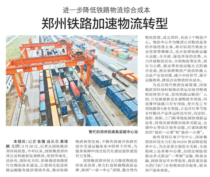 3月26日,记者从国铁集团郑州局获悉,今年以来,国铁集团郑州局立足构建新发展格局,坚持市场化、法治化、国际化方向,积极推进铁路现代化物流体系建设,以便利化促进铁路运输服务提质增效升级,推动铁路物流转型发展,不断巩固提升铁路在综合交通运输体系中的骨干作用,为服务保障中国式现代化建设提供更加有力支撑。(今日《郑州日报》6版)